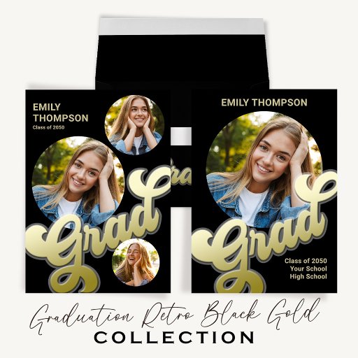 Ce design est composé d'un modèle moderne moderne moderne design simple collage photo invitation, avec un code QR scannable modèle et Facebook icône de médias sociaux, parfait pour le lycée ou l'université, un élégant rétro noir et or, audacieuse typographie minimaliste tendance, une classe de gris classe de 2024, avec un seul 1 modèle de mise en page photo, un grand invitation de graduation, vellum transparent photo overlay, dégradé or lettrage texte police, photo principale photo