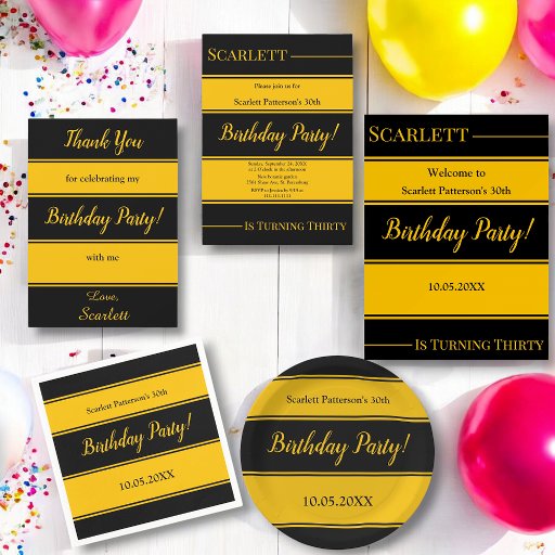 Cette élégante invitation d'anniversaire en noir et or est parfaite pour un anniversaire moderne. Le design simple présente une calligraphie noir et or élégante sur un arrière - plan rayé noir et or.