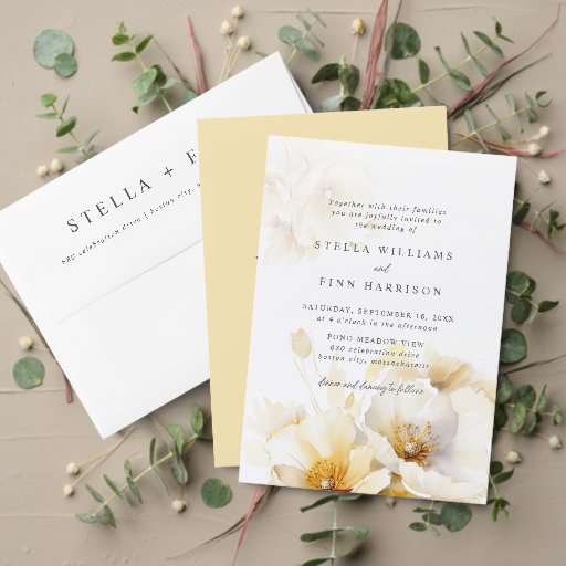 Invitation Elégant Blanc Jaune Or Fleurs Détails Mariage