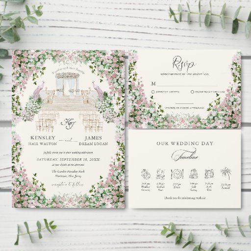A romantic watercolor garden wedding invitation featuring lush blush blossoms, elegant greenery, and a personalized monogram. This enchanting invitation features a hand-painted garden archway, delicate pink and blush flowers, graceful greenery, and refined seating details that create the perfect blend of artistry and sophistication. Ideal for outdoor, botanical, and spring weddings. Easily customize names, details, and fonts for your perfect celebration.
