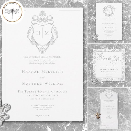 Invitation Elegant Grey Chinoiserie Bird & Crest Mariage