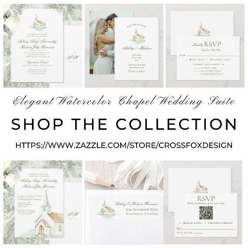 Elegant Watercolor Church Wedding Invitation. This elegant wedding invitation features a delicate, hand-painted watercolor illustration of a traditional white chapel. Lovely green script text for the names of the bride and groom, paired with elegant serif font for the detials. Monogram initilals on the back of the inviation. Perfect for traditional church ceremonies, spring or summer weddings, and couples seeking a romantic, fine-art aesthetic for their special day. Contact the designer for any customization questions