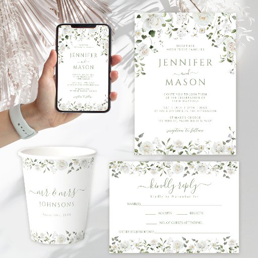 Celebrate in style with this elegant and timeless botanical bridal shower invitation, featuring a delicate white watercolor rose and peony flowers surrounded by lush greenery and eucalyptus leaves. Perfect for a spring or summer bridal shower, this charming design beautifully complements boho, garden, and nature inspired celebrations.