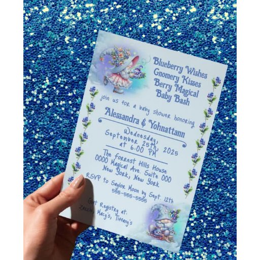 "Blueberry Wishes et Gnomery Kisses" est une invitation qui capture magnifiquement l'essence de la célébration d'une nouvelle vie. Ce design présente des nuages, des teintes bleues et violettes, ce qui le rend approprié pour une Baby Shower garçon, tandis que les gnomes filles en jupes mignonnes le rendent également approprié pour une Baby Shower fille. Ce thème enchanteur de myrtilles et de gnomes incarne la magie de l'accueil d'un nouveau bébé. L'imagerie délicieuse de myrtilles juteuses associées aux gnomes fantaisistes crée une invitation qui inspire la joie et l'émerveillement pour tous les invités. Rendez votre baby shower inoubliable ! Découvrez notre collection pour plus d'idées amusantes pour célébrer cette occasion spéciale.