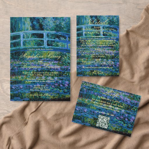 This fine art wedding stationery design captures the romance of impressionist brushstrokes and the serenity of Monet’s water garden, making it perfect for art-inspired weddings, moody evening receptions, and romantic outdoor or botanical garden venues.