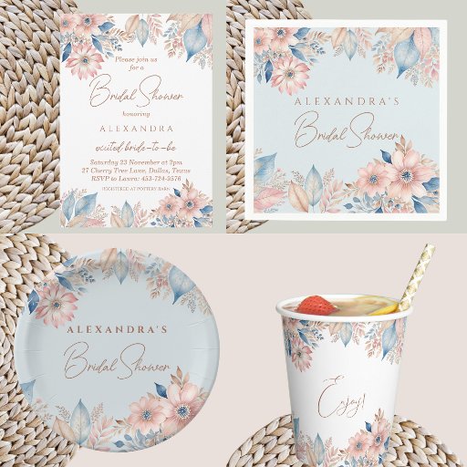 Personnalisez cet ajout parfait à votre Fête des mariées Florale Boho : une Invitation exquise qui ravira les futurs mariés. Ce bel invitation arbore un design de feuilles et de fleurs roses, beiges et bleues poussiéreuses, astucieusement disposés contre un arrière - plan blanc immaculé. Le design féminin et élégant capte l'essence du style rustique et bohème, ce qui en fait l'endroit idéal pour une fête de Fête des mariées Boho Chic, un déjeuner ou un pique-nique. Chaque invitation dégage charme et sophistication, donnant le ton d'une célébration inoubliable remplie d'amour et de joie.
