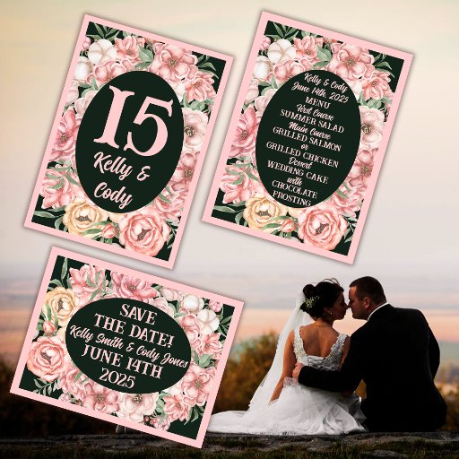 Invitation Fleur rose et beige ovale sur Mariage vert profond