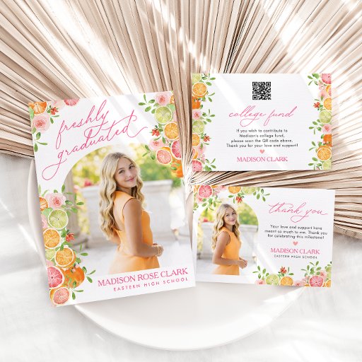 Celebrate your graduate with this Freshly Graduated citrus floral announcement card, featuring bright oranges, limes, grapefruits, soft florals, and a cheerful summer-inspired design.