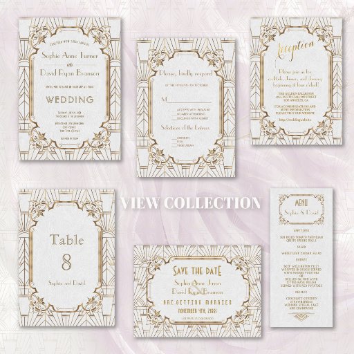 Elégant, White Gold Great Art Déco Mariage des années 1920Design unique et élégant avec Roaring 20s Great vintage faux or style ornemental sur un arrière - plan texturé blanc. Utilisez l'outil Personnaliser pour ajouter vos informations. Pour les objets correspondants, visitez ma collection White Gold Great Art Déco 1920s.