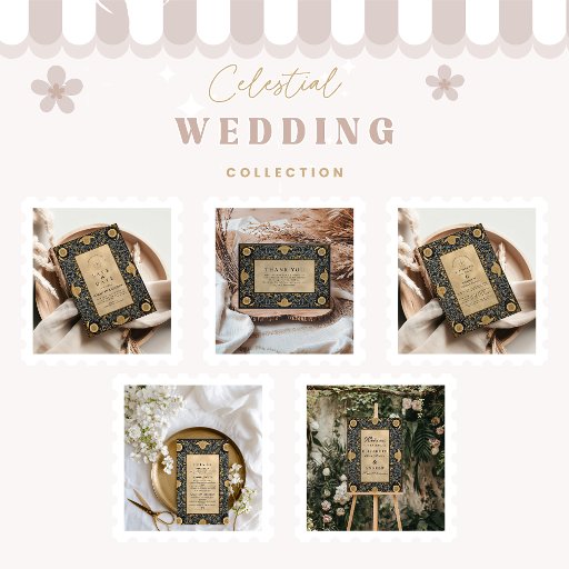 A luxurious celestial design framed in ornate baroque gold and deep midnight blue. This invitation blends moonlit elegance with vintage artistry, creating a regal and mysterious aesthetic. Perfect for weddings inspired by the cosmos, mythology, or timeless romance under the stars — where every detail feels like part of a celestial dream.