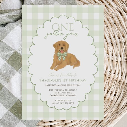 Célébrez le premier anniversaire de votre petit avec cette invitation d'anniversaire "Une année d'or". Cette adorable invitation présente des en vichy vertes, un récupérateur d'or portant un arc vert, et des empreintes de pattes ludiques. Parfait pour les familles amateurs de chiens, ce design sucré ajoute une touche de charme à toute fête d'anniversaire.