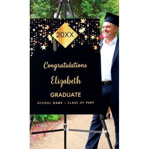 Une invitation moderne et élégante à une fête de remise de diplômes 2023. Pour lui et elle. Un classique arrière - plan noir, des banquettes dorées et noires comme décor. Personnalisez et ajoutez un nom et des détails du parti. Le texte Graduation et le nom sont écrits avec un script de style manuel moderne. Lettres d'or.