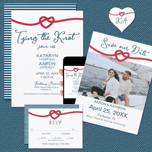 Classique, classe et amusant marine bleu marine sur blanc avec accent rouge conception de cordes coeur. Customisez avec toutes vos informations personnalisées ! Montré sur du papier brillant blanc semi-brillant, choisissez parmi une sélection de qualité de beaux papiers et des formes d'invitation. Découvrez les articles complémentaires de la collection Tying the Knot ! Option de téléchargement disponible.