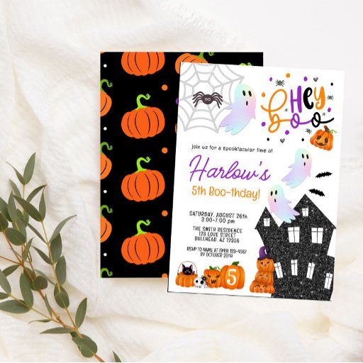 Purple, Black et Orange Hey Boo Halloween Party avec Ghost et une invitation d'Anniversaire Maison Haunted