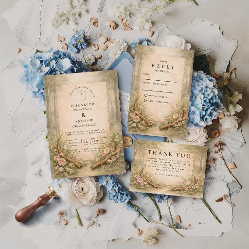 Un design romantique inspiré de la forêt, avec des florales neutres douces, des bois de cerf élégants et un fond de parchemin vintage chaud. La composition mélange la verdure organique avec des détails raffinés pour une esthétique boho intemporelle qui se sent à la fois intime et élégante. Parfait pour les couples attirés par la nature, le luxe discret et la romance classique avec une touche rustique.