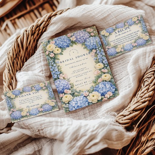 Un design de baby shower romantique inspiré des jardins, mettant en vedette de luxuriantes hortensias bleues poussiéreuses associées à des roses ivoire douces et à de délicates fleurs de prairie. Les florales encadrent la composition dans une élégante disposition symétrique avec des détails classiques subtils, créant une esthétique raffinée et intemporelle. Le fond de parchemin chaud rehausse la douceur de la palette bleue tout en conservant une atmosphère élégante et raffinée. Parfait pour une célébration sophistiquée avec une fraîche élégance de jardin.