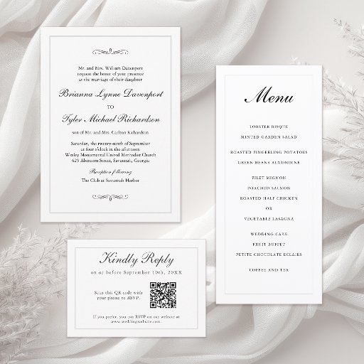 Faire-part de mariage de bon goût à la simplicité classique, ce design présente une fine bordure argentée entourant votre texte et agrémentée de fioritures de calligraphie. Vous pouvez ajouter, supprimer ou ajuster le placement du texte en fonction de vos besoins. L'arrière - plan blanc toujours populaire ajoute à la simplicité propre de ce design.
