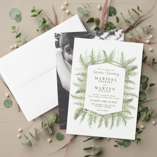 Aquarelle feuillage à feuillage persistant vert épinette sapin pin aiguilles wreath physiquement non-invité mais maintenant invitation à la diffusion en direct faire-part de mariage. idéal quand un en raison de restrictions sur le nombre de invités ont besoin d'être déinvité à l'événement de mariage d'hiver réel, mais vous voulez toujours là-bas. Personnalisez avec vos propres détails mariages. Photo originale de Sarah Trett pour www.mylittleedenweddings.com sur Zazzle.