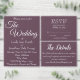 Style simple, faire-part de mariage qui comporte un arrière - plan de couleur aubergine tendance avec les futurs noms de mariée et mariée et la date de l'événement, l'heure, l'emplacement et le registre imprimé en blanc, stylisé. Personnalisez votre faire-part de mariage en remplaçant l'info par la vôtre. Sélectionnez le style et la quantité de papier d'invitation. Conçu pour coordonner avec notre collection de Mariages Eggplant Simple Style.