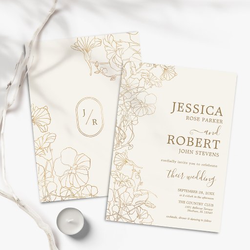Faire-part de mariage florale en crème d'ivoire et fausse feuille d'or. La conception minimaliste du boho comporte des accents botaniques dessinés à la main, une police de script de typographie et un monogramme au dos de la carte. Invitations Zazzle imprimées ou téléchargement instantané modèle imprimable numérique.