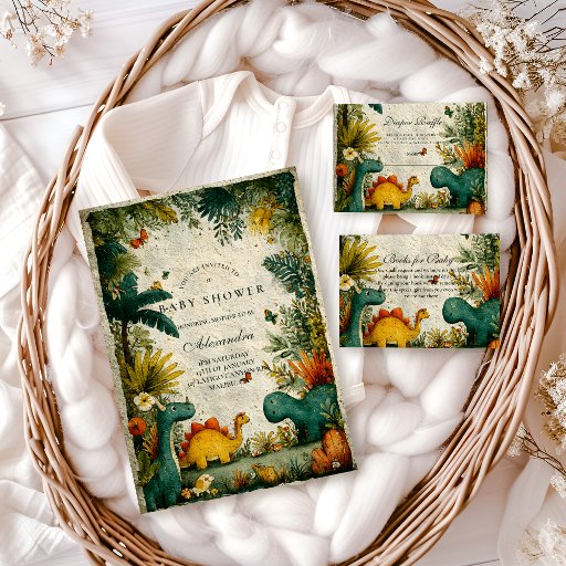 Step into a lush prehistoric paradise with this vintage-style dinosaur design. Featuring palm trees, ferns, and gentle dinosaurs in warm earthy tones, it’s perfect for a baby shower with adventure and charm. A timeless blend of tropical greenery and whimsical Jurassic nostalgia.