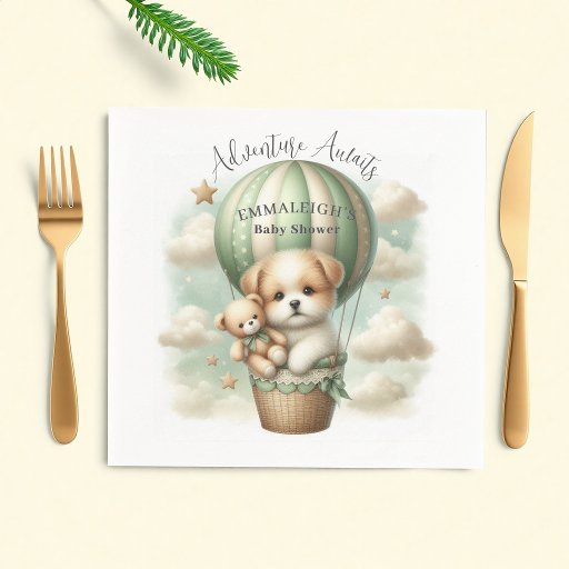 Captivant "Let the Adventure Begin" invitation à baby shower thématique avec un adorable chiot tenant un ours en peluche à cheval dans une montgolfière verte et blanche. Le ciel vert aquarelle a des nuages blancs avec des étoiles dorées environnantes. Motif étoile blanche sur un arrière - plan vert moyen à l'arrière de l'invitation. Modèles fournis.