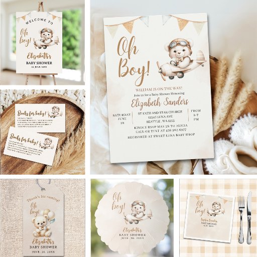 Celebrate your baby's upcoming arrival with ours with this cute bear design. Featuring a beautiful image of a cute bear piloting a small plane and the cheerful phrase "Oh Boy," it makes this design the perfect style to create a cheerful and whimsical tone for your event. For complementary products, please check out the collection of this cute design for a boy's baby shower.