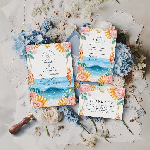 Set the tone for a dreamy seaside celebration with this pastel coastal design, featuring watercolor shells, soft pink florals, golden hanging details, and serene ocean waves. The gentle nautical palette gives this piece an elegant, sunlit, beach-romance feeling while keeping the focus on your event details. Perfect for couples planning an oceanfront ceremony, coastal destination, or summer wedding by the water.