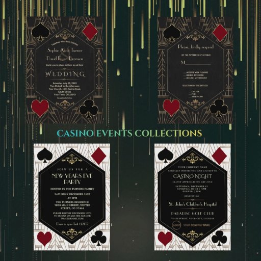 Glam card design, Casino themed. It features a Roaring 1920's old Hollywood Art Deco style shape, royal faux gold fleur-de-lis dividers, vintage fonts, as well playing cards suits with a golden edges. Use Personalize tool to add your information. For more, visit please, my Casino Poker Wedding Collection.