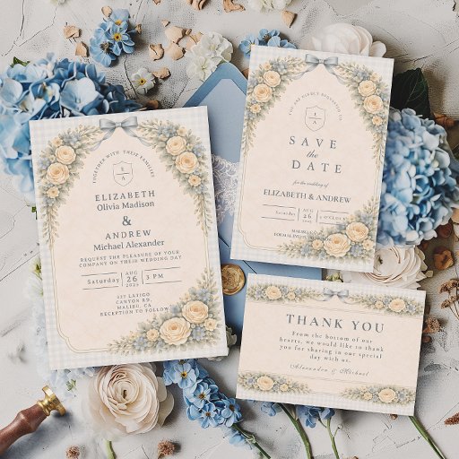 A romantic vintage rose arch frames this timeless garden wedding design, featuring soft blush blooms, sage greenery, and a warm parchment background. The structured botanical border creates an elegant vertical silhouette, while the classic serif typography adds refined, old-world charm. Perfect for formal garden ceremonies, estate venues, and couples who love traditional floral elegance with a European touch.