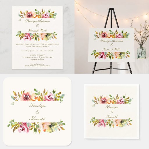 This wedding invitation features soft blush, dusty rose, and peach watercolor florals with sage green leaves on a warm ivory background. The floral bouquets frame your names and wedding details above and below, giving the whole card a lush, romantic feel. It's a great fit for a garden ceremony, a spring or summer outdoor wedding, or any couple who loves a classic botanical look with a vintage, cottage garden vibe.