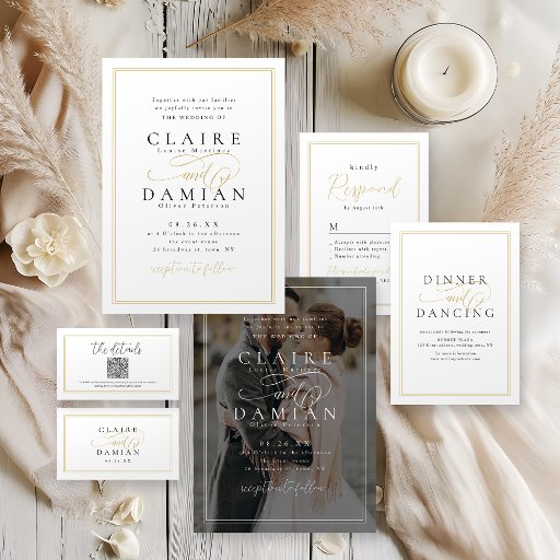 L'invitation de la fête de fiançailles romantique comprend un script élégant et d'élégants détails d'événement de police en or et noir, moderne et simple, idéal pour le mariage formel minimaliste, mariage classique traditionnel, mariage simple moderne. Voir toutes les pièces correspondantes dans la collection.