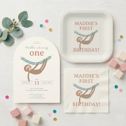 This sweet and calming Slumberkins Sloth design features the beloved Sloth character wearing a tiny crown, set within a peaceful landscape of rolling hills, soft clouds, twinkling stars, and a warm rising sun. The gentle illustration style and muted, earthy color palette create a soothing and nurturing atmosphere that feels perfect for a first birthday or early childhood celebration. Playful details and thoughtful spacing allow personalized party information to shine while maintaining the comforting, story-driven Slumberkins aesthetic. This design is ideal for parents looking for a warm, imaginative, and emotionally comforting theme for a young child’s birthday celebration.