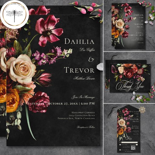 IL EST ÉGALEMENT DISPONIBLE AVEC UN CODE QR OU AVEC OU SANS CHOIX DE DÎNER. Entrez dans un royaume d'élégance exquise avec notre faire-part de mariage florale sombre et moody. Conçue pour captiver les sens, cette invitation se targue d'un arrière - plan noir frappant, agrémenté d'un éclat époustouflant de fleurs automnales dans des tons bordeaux, orange brûlé, crème, et de touches d'or luxueux, complétées par un feuillage vert olive luxuriant. Le texte crémeux flotte délicatement sur un doux flou de lumière, ajoutant une touche de romantisme à l'allure générale. Faites preuve d'opulence de la saison et donnez le ton de votre journée spéciale avec cette invitation étonnante, qui laissera une impression durable à vos invités. Créé par Simply Farmhouse Press.