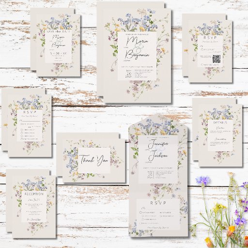 Célébrez votre journée spéciale avec élégance et grâce avec notre faire-part de mariage étonnante avec un design magnifique et délicat. Conçu avec une attention minutieuse aux détails, notre invitation se targue d'une zone de texte blanche embrassée par un cadre de fleurs sauvages enchanteurs dans les tons blanc, bleu, lavande, rose et jaune doux, sur fond de blanc crème onirique. Cette combinaison exquise crée une esthétique intemporelle et romantique, parfaite pour les couples à la recherche d'une touche de sophistication et de simplicité pour leur célébration mariage. Invitation vos proches à partager dans votre joyeuse occasion avec une invitation qui capture l'essence de votre histoire d'amour. Laissez chaque détail parler des volumes de votre journée spéciale. Choisissez notre élégante invitation de mariage et donnez le ton pour une célébration pour se souvenir éternellement. Créé par Simply Farmhouse Press.
