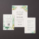 This beautiful tropical beach destination wedding invitation features simple green and gold watercolor tropical palm foliage on the front and back, along with bold modern typography and delicate gold details. This invitation is named Tulum because it's perfect for a beach destination or summer wedding.