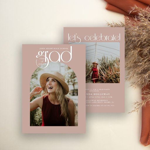 un script de typographie moderne propre et chic avec un cadre photo voûté sur un arrière - plan bleu marine. Customisez facilement avec vos photos de remise de diplômes et les détails de l'invitation à l'avant et à l'arrière.