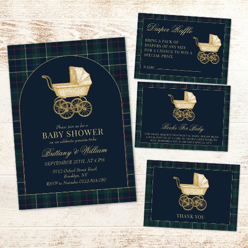This design features a vintage baby shower theme with a classic baby carriage on a navy and green tartan plaid with golden accents. Ideal for rustic luxury baby shower. This product can be easily personalized. If you need help with the customization of the product or need matching products kindly please contact me via Zazzle.
