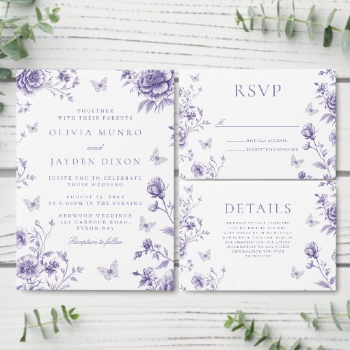 Invitation Vintage Enchanté Papillon violet Mariage floral