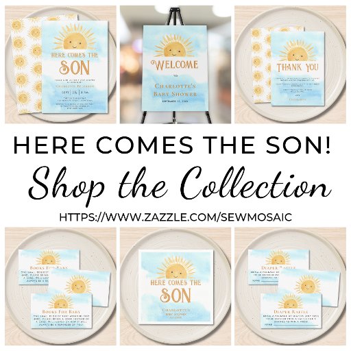 Famille Invitation et amis à votre baby shower sur le thème du soleil avec cette mignonne invitation de baby shower pour garçons de soleil. Il présente le texte "Here Comes The Son" en typographie élégante avec un joli soleil jaune sur un arrière - plan bleu aquarelle. Le dos est décoré d'un motif souriant. Facile à personnaliser. Aquarelle originale © Michele Davies.
