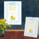 Baby blue gingham baby shower with a hand drawn bow. Water droplets frame a rubber duck surrounded by bubbles