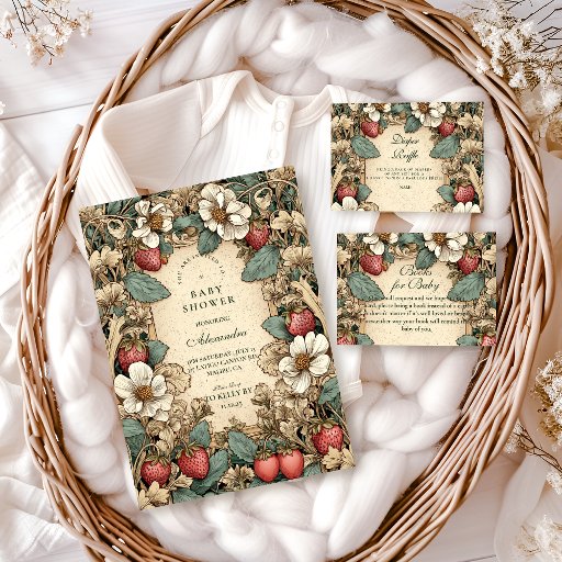 Celebrate a sweet new arrival with this vintage strawberry cottagecore baby shower design. Featuring detailed strawberries, soft florals, and a classic storybook-style frame, this invitation has a warm, nostalgic feel that’s perfect for a cozy, nature-inspired baby shower. Ideal for spring or summer celebrations, garden themes, and parents who love timeless, whimsical designs.