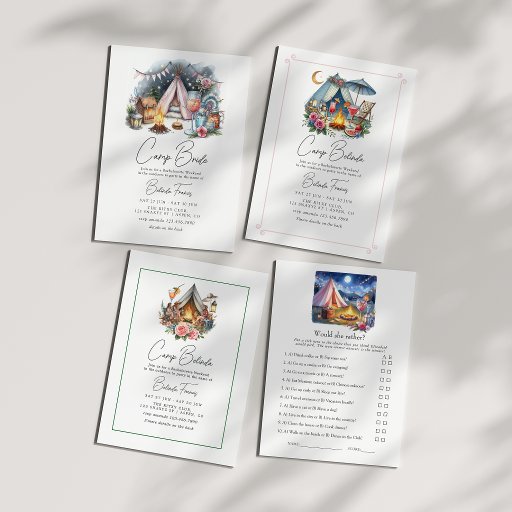 Bring fun and laughter to your getaway with this “Camp Bride” bachelorette weekend game card. Featuring a cozy camping scene with a glowing tent, campfire, and scenic outdoor setting, this design is perfect for cabin trips, glamping weekends, or outdoor hen party celebrations.