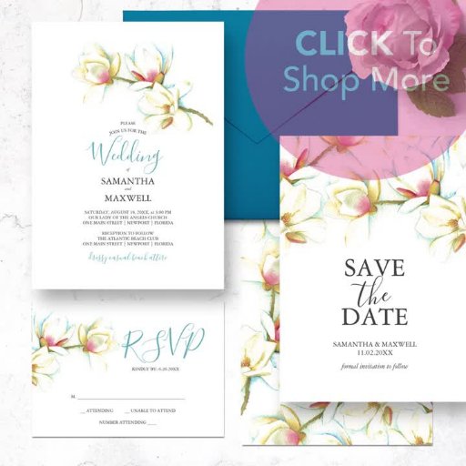 Ces invitations de mariage comprennent des fleurs de magnolia aquarelle. La carte revient à un bleu turquoise solide avec votre code QR. Un choix botanique pour des mariages ou des mariages en plein air et durables à un budget limité. Art unique et design de Victoria Grigaliunas de Do Tell A Belle.