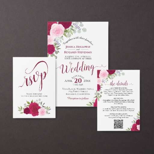Invite your loved ones to share in your joy on your wedding day with these gorgeous acrylic invitations. The stylish boho chic floral design features your names prominently displayed in bold letters while the introduction and other notes feature fancy script calligraphy with swashes on the ends of the letters. The text is displayed on a deep marbled magenta colored background, while the outside border of the invite is transparent acrylic with hand painted hot pink and blush colored watercolor roses and garden greenery decorating the corners. Elegant, classy, sophisticated and beautiful, these wedding invitations are sure to leave a lasting impression.