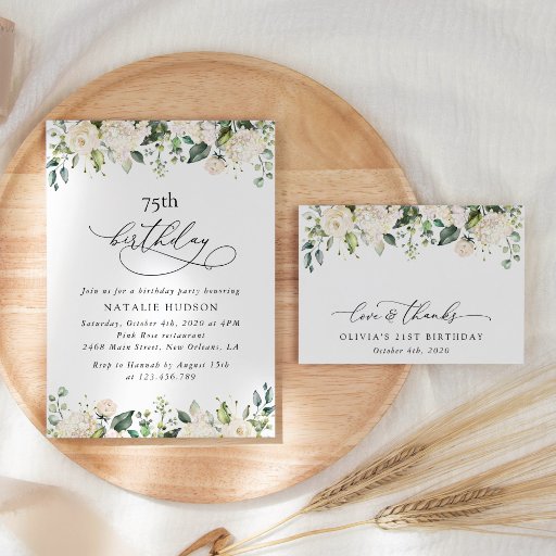 Invitations amis et famille dans le style et donner le ton pour votre journée spéciale avec cette charmante invitation d'anniversaire. Le design présente des fleurs d'aquarelle blanche et de la verdure.