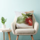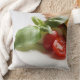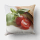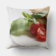 Gooi een kussen met gezond Italiaans voedsel, bestaande uit een panini-sandwich en een tomaat, groene basilicumbladeren en mozzarella-kaas op een witte achtergrond.