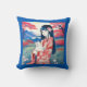 Gooi een kussen in een portret van een sereen jong meisje in traditionele Japanse kledij met een witte kat in een rustig landschap, met levendige rode en pastelblauwe tinten die een harmonieuze achtergrond creëren. Het tafereel toont verre bergen, bloeiende bomen en een meer.
