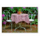 Table et chaises à l'ancienne dans un jardin rhododendron.