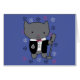 Een schattige grijze poeskat in kawaii-stijl draagt een smoking, een wit shirt en een roze stropdas en zingt jazzliedjes in een microfoon tegen een paarse achtergrond vol met roze, zwarte en witte retro-geïnspireerde sterren uit de jaren vijftig